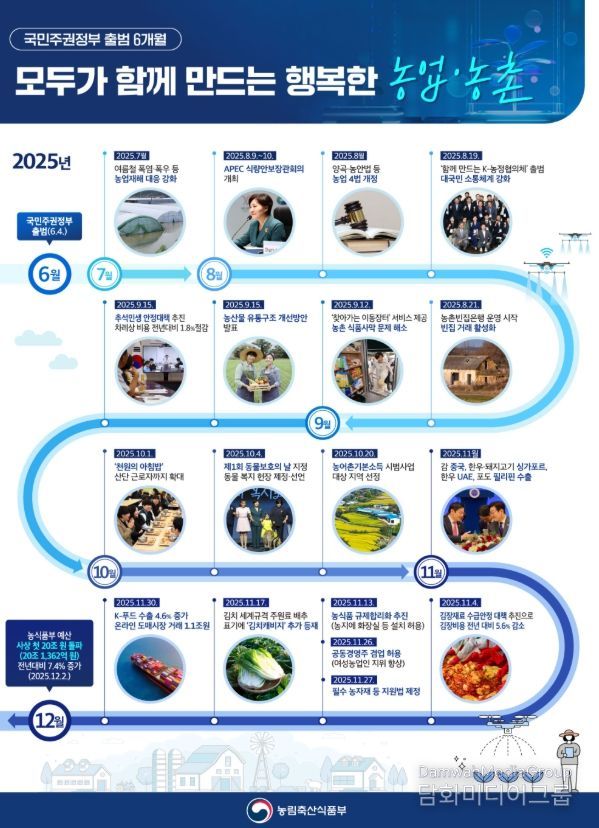 외교저널 (Diplomacy Journal) 강갑수 기자 | 농림축산식품부는 새 정부 출범 후 약 6개월동안 정책의 연속성과 과감한 혁신 기조 하에서 현장에서 체감할 수 있는 변화를 이끌어 내는 동시에, 만성적 쌀 공급 과잉, 농촌 고령화 등 농업·농촌의 구조적 문제 해결과 희망을 실현하는 농업·농촌을 만들기 위해 전력을 다하고 있다.