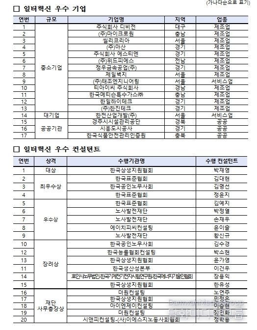 1부에서는 공모와 심사를 통해 선정된 일터혁신 성과 우수기업 17개소와 컨설턴트 경진대회를 통해 선정된 우수 컨설턴트 20명에 대한 시상이 진행됐다.