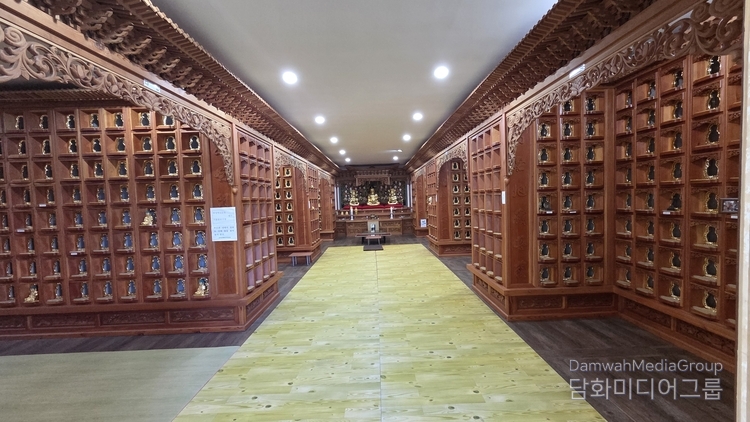 정심원은 이러한 도량의 정신을 가장 충실히 반영한 층으로, 슬픔·애도·그리움이라는 감정이 번뇌의 물결에서 멈추고 고요靜心의 지혜로 전환되는 수행의 공간으로 디자인되었다. 은은한 황금빛 조명은 부처님의 지혜광명을 상징하고, 벽면과 여백의 구성은 불교 미학의 핵심인 적요寂寥, 삼매三昧의 기운을 담아 참선과 기도의 흐름을 자연스럽게 이끌어 준다.