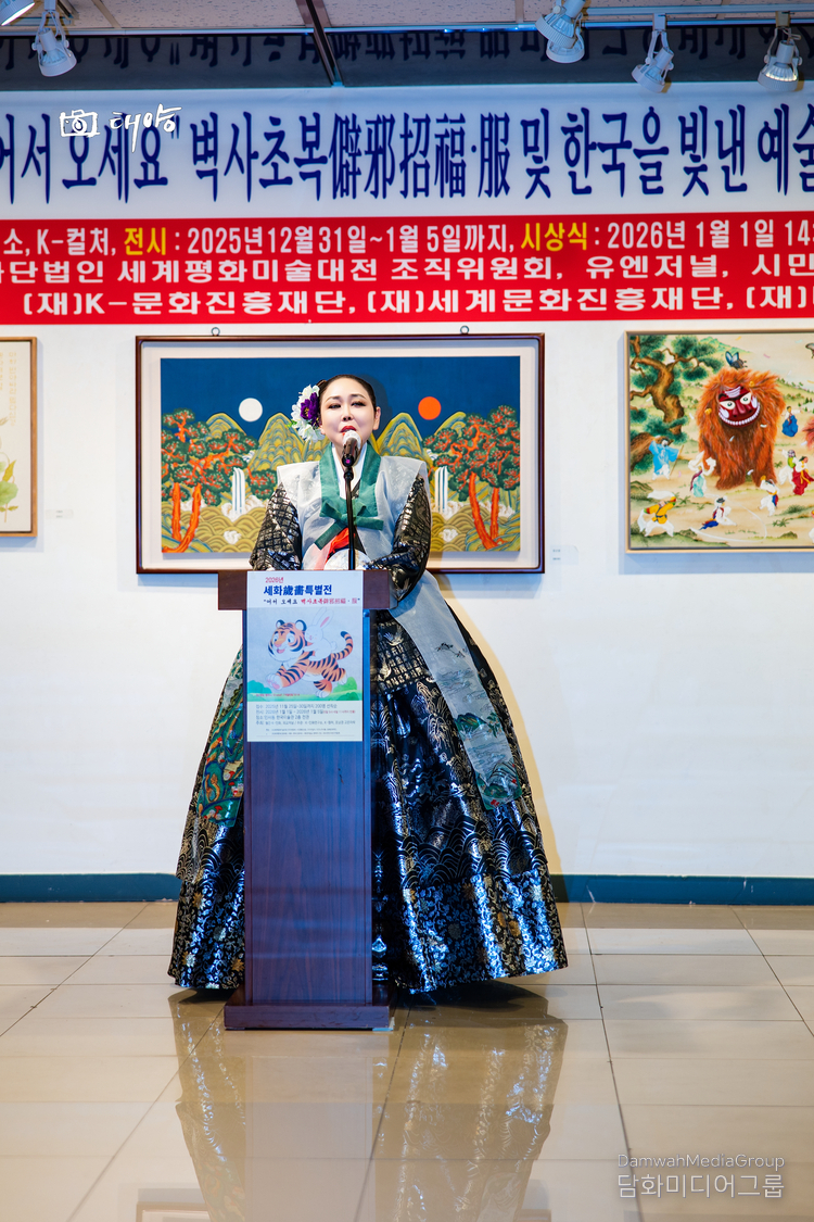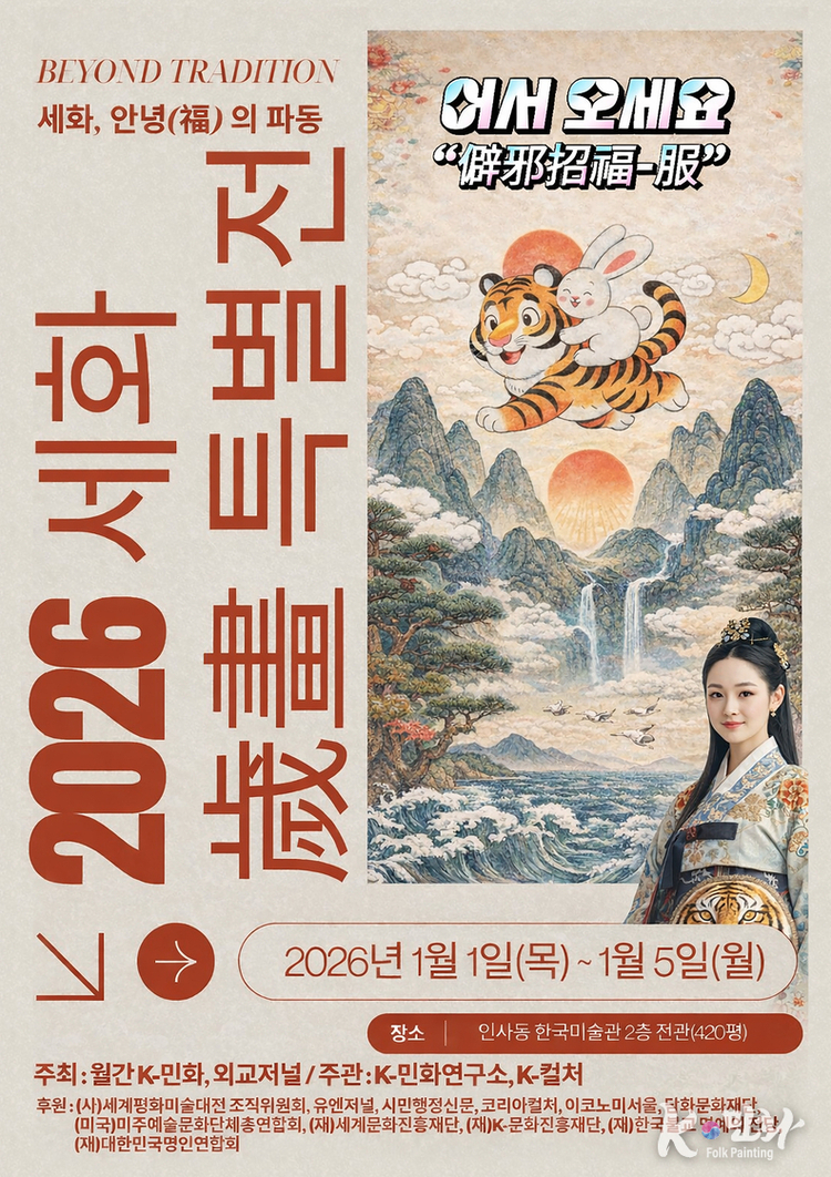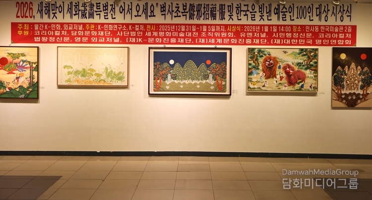 외교저널 (Diplomacy Journal) 이정하 기자 | 2026년 병오년 새해 첫날인 1월 1일, 서울 인사동 한국미술관 2층 전관에서 열린 2026 세화歲畫 특별전 「어서 오세요, 벽사초복僻邪招福·服」이 내외 귀빈과 관람객 200여 명이 참석한 가운데 성황리에 개막했다.