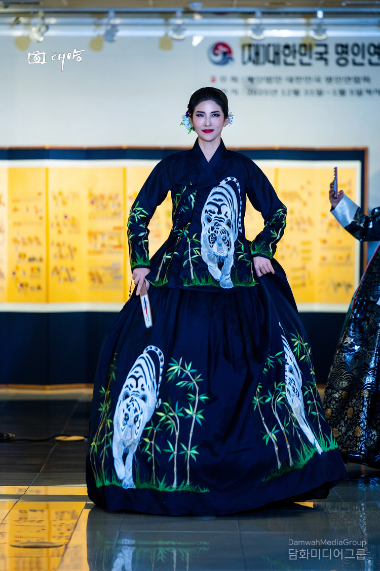 이번 전시의 중심에는 조낭경 대표가 이끄는 고은자락의 K-민화한복이 있었다. 조 대표는 민화 속 호랑이, 사자, 길상문, 복福의 상징들을 한복의 선과 색으로 재해석해 무대 위에 올렸다.