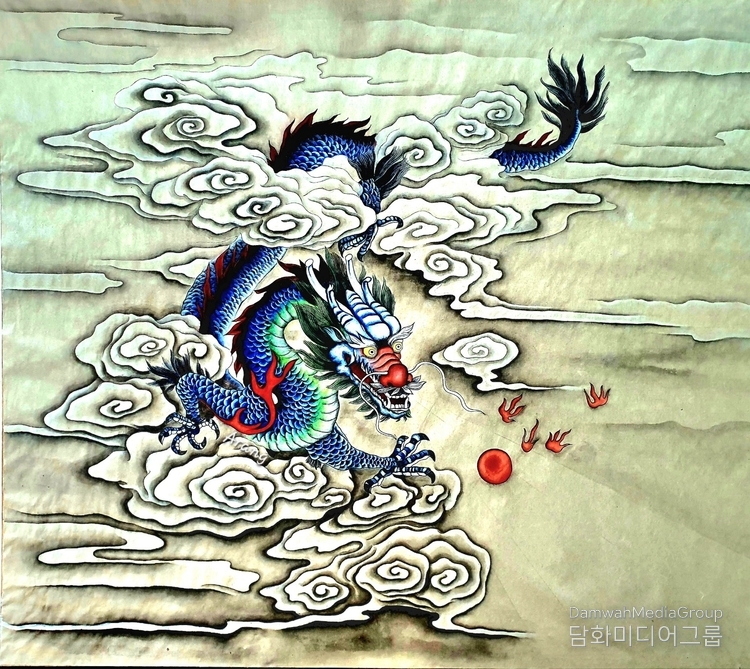 구름 또한 중요하다. 이 작품에서 구름은 배경이 아니라 장막이다. 보이지 않는 세계와 보이는 세계 사이를 가르는 경계이자, 신령이 드나드는 통로다. 용은 그 구름을 헤치고 나오며, 이는 곧 차원을 넘는 출현을 의미한다. 무속에서 신령의 형상은 언제나 ‘갑작스러운 현현’으로 나타난다. 이 작품은 그 순간을 포착한 기록에 가깝다.