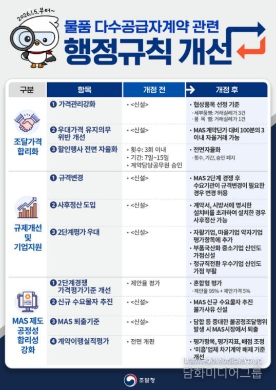 외교저널 (Diplomacy Journal) 이준석 기자 | 조달청은 조달 가격의 신뢰성을 높이고, 공공조달에 남아 있는 불합리한 규제를 혁파하기 위해 '물품 다수공급자계약 관련 행정규칙 2종'을 개정하여 2026년 1월 5일부터 시행했다고 밝혔다.