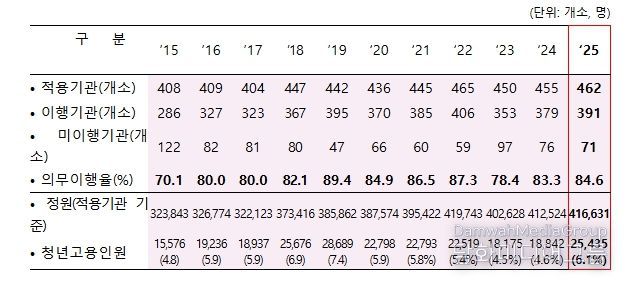 2025년 공공기관 청년고용의무 이행결과에 따르면, 적용기관 462개소의 84.6%(391개소)가 청년고용의무를 이행한 것으로 조사되어 2024년(83.3%, 379개소) 대비 1.3%p(+12개소) 증가했다.