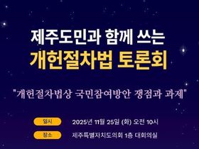 외교저널 (Diplomacy Journal) 김학영 기자 | 제주특별자치도의회, 제주특별자치도 주민자치위원회협의회, 제주대학교 리걸클리닉센터, 제주미래디자인포럼, 사회적협동조합 제주로 공동 주최로 11월 25일 오전 10시, 제주특별자치도의회 1층 대회의실에서 '제주도민과 함께 쓰는 개헌절차법 토론회'를 개최한다.